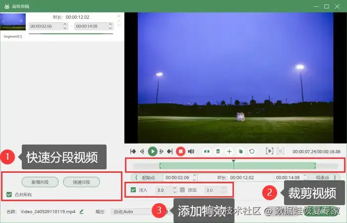 步骤5:录制完成后,进入 【高级剪辑】 页面裁剪视频为视频添加特效,然后点击 【剪辑】 按钮结束本次录屏,并将视频保存到您的电脑上。