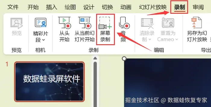想要快速录制教学视频,可以使用PowerPoint自带的录屏功能。只需要点击PPT文稿上方的 【录制】 ,选择【屏幕录制】,框选好录制范围后进行录屏。但录制的文件会存在声画不同步现象。