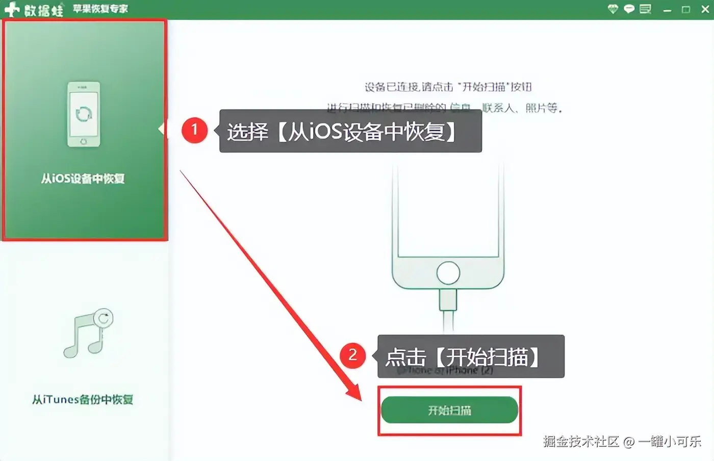 步骤2:使用USB数据线将你的苹果设备连接到电脑。软件启动后,选择 【从iOS设备恢复】 模式,软件会开始扫描你的设备,请耐心等待扫描过程完成。