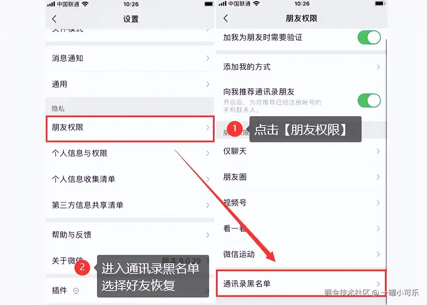 步骤2:在【朋友权限】界面下拉找到并进入 【通讯录黑名单】 ,选择需要解除黑名单的好友,点击恢复即可。