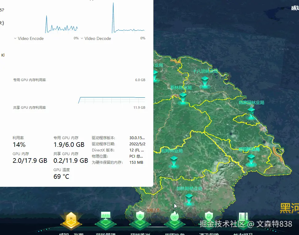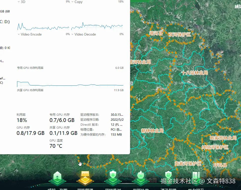左侧第一个按钮为cesium的功能,第二个按钮是二维的leaflet功能,从第二个切到第一个按钮明显会看到显存曲线的上升趋势,但是从第一个切到第二个时,回落不明显,显存发生泄露,显存占用越来越大,风险很大