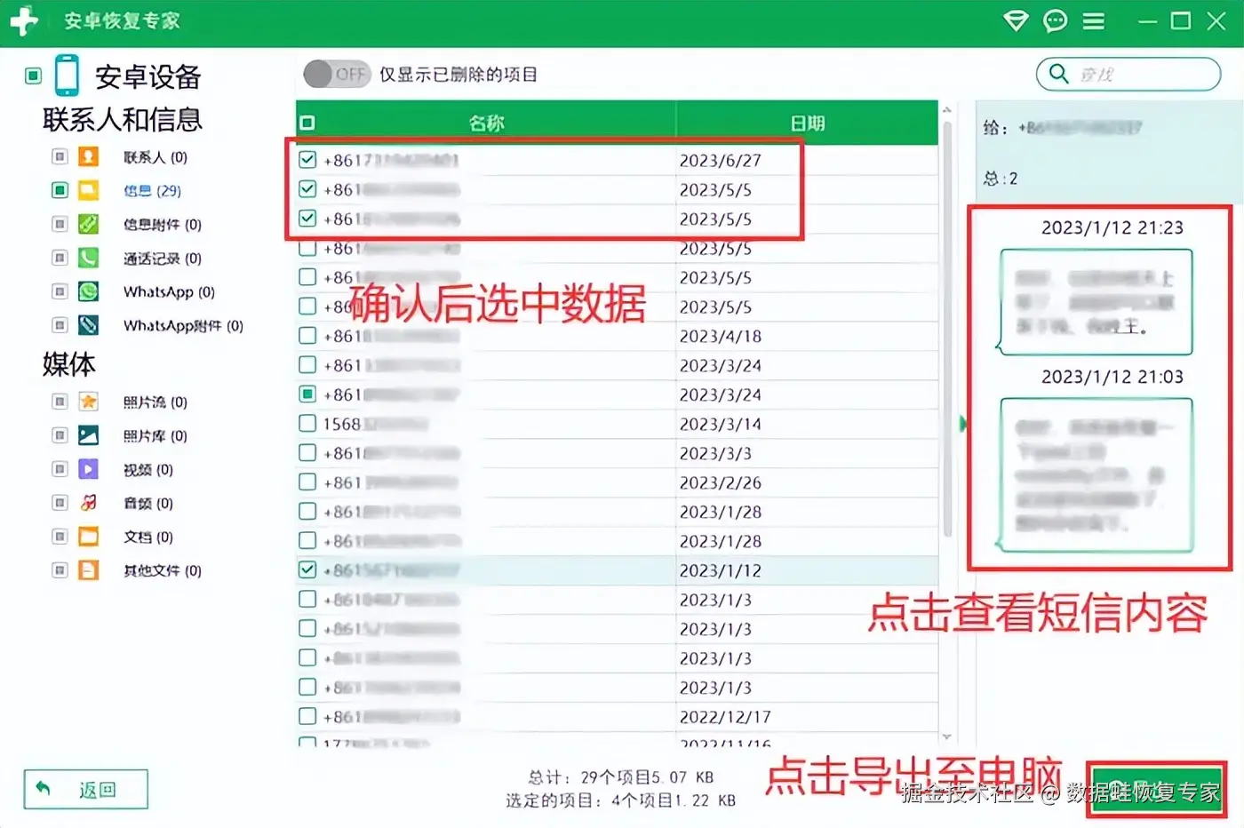 第三步:扫描结束后,软件会展示一个短信列表。用户可以在此列表中查找并预览想要恢复的信息。确认无误后,选择需要恢复的项目,点击 【导出】 按钮,将文件保存到电脑上指定的位置。