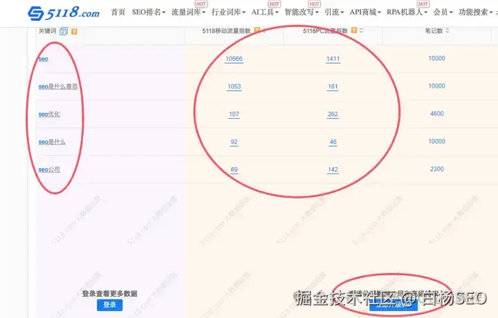 比如上图,小红书聚光里,我们行业,【SEO】这个词在小红书上每个月大约是两万三千多搜索量,平均每天大约800搜索量。如果你没有聚光,用的第三方工具(市场上有很多,白杨SEO推荐5118),可以看下如下图:
