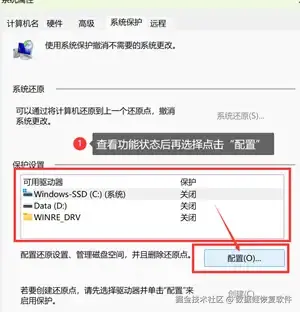 点进电脑“设置”,在设置里的搜索框内输入“系统还原”,点击“创建还原点”后弹出“系统保护界面”。该页面可以查看电脑文件保护功能的状态,如显示是开启的状态,点击“配置”后按照指示继续操作;未开启则可以选择跳过这个方法。