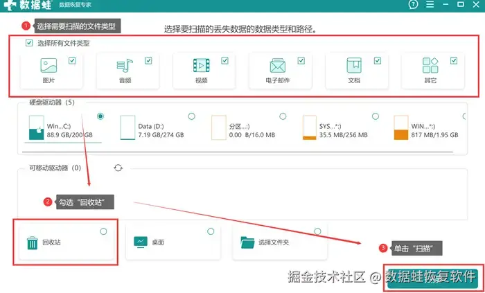 第二步: 在第一个页面上勾选好需要恢复的文件类型和位于左下方的回收站,回收站在这里可直接作为扫描路径,更为方便。选择完后,点击“扫描”即可。