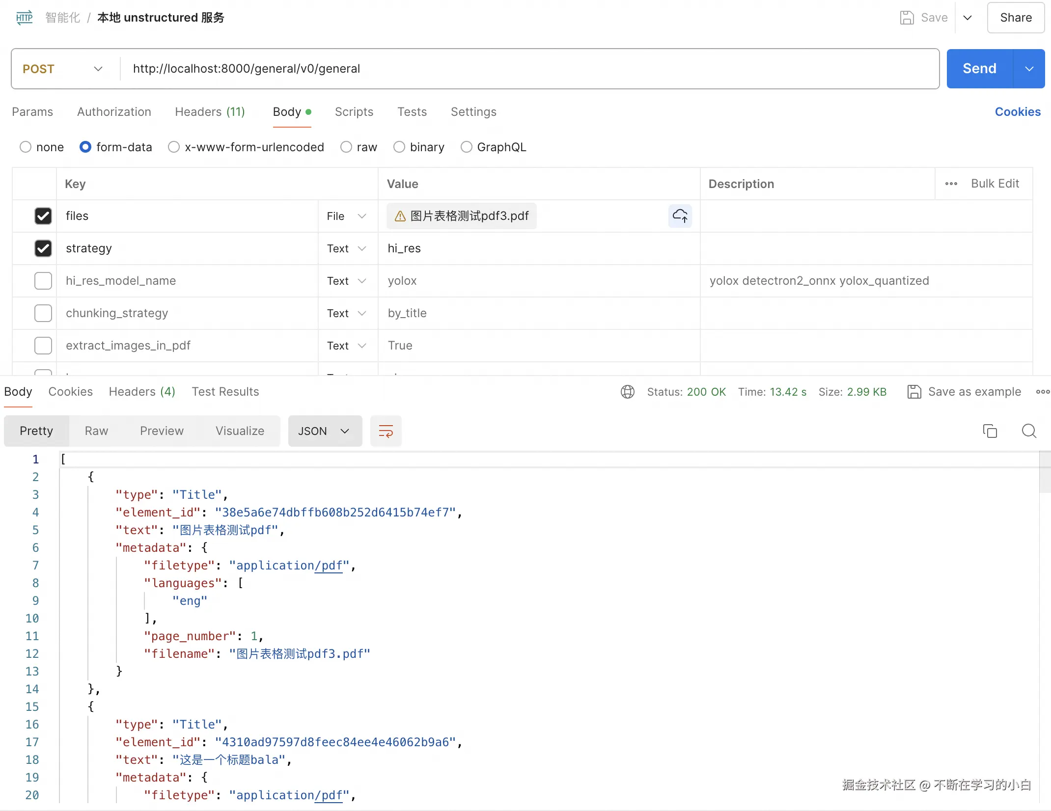 设置请求body,"files"文件列表,"strategy"解析策略,"hi_res"代表启动大模型加持解析,效果会更准确(对PDF类型生效),但是接口RT会大幅降低