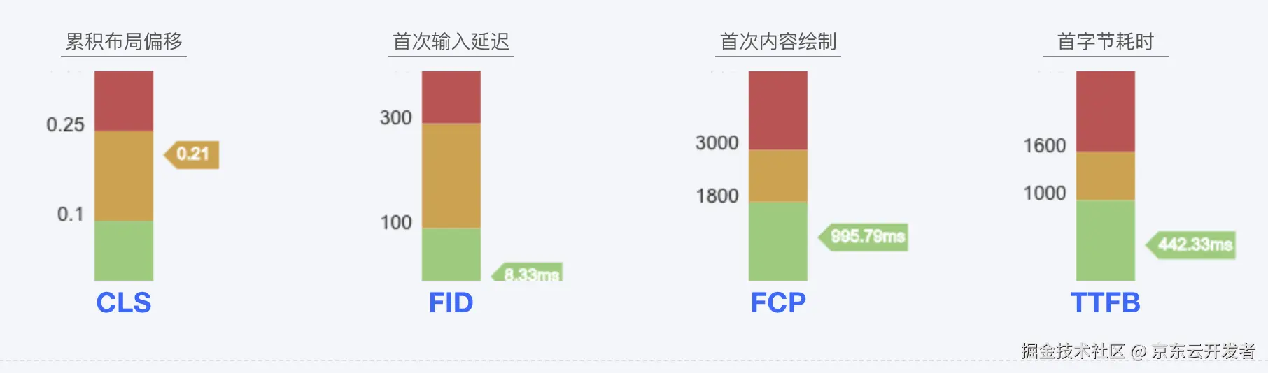 •FID:用户首次发出交互指令到页面可以响应为止的时间差。标准性能指标 100ms