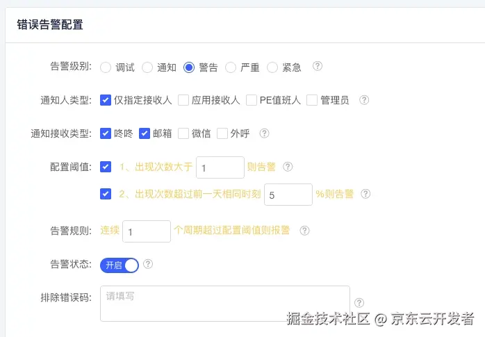 我们通过配置错误关键词来匹配控制台的报错信息。报错阈值的设定可以参考各个项目的 QPS,因为在项目实施了恰当的降级策略后,即便控制台出现报错,页面通常仍能正常访问,不会对用户体验造成影响。因此,这个阈值可以适当设置得较高。
