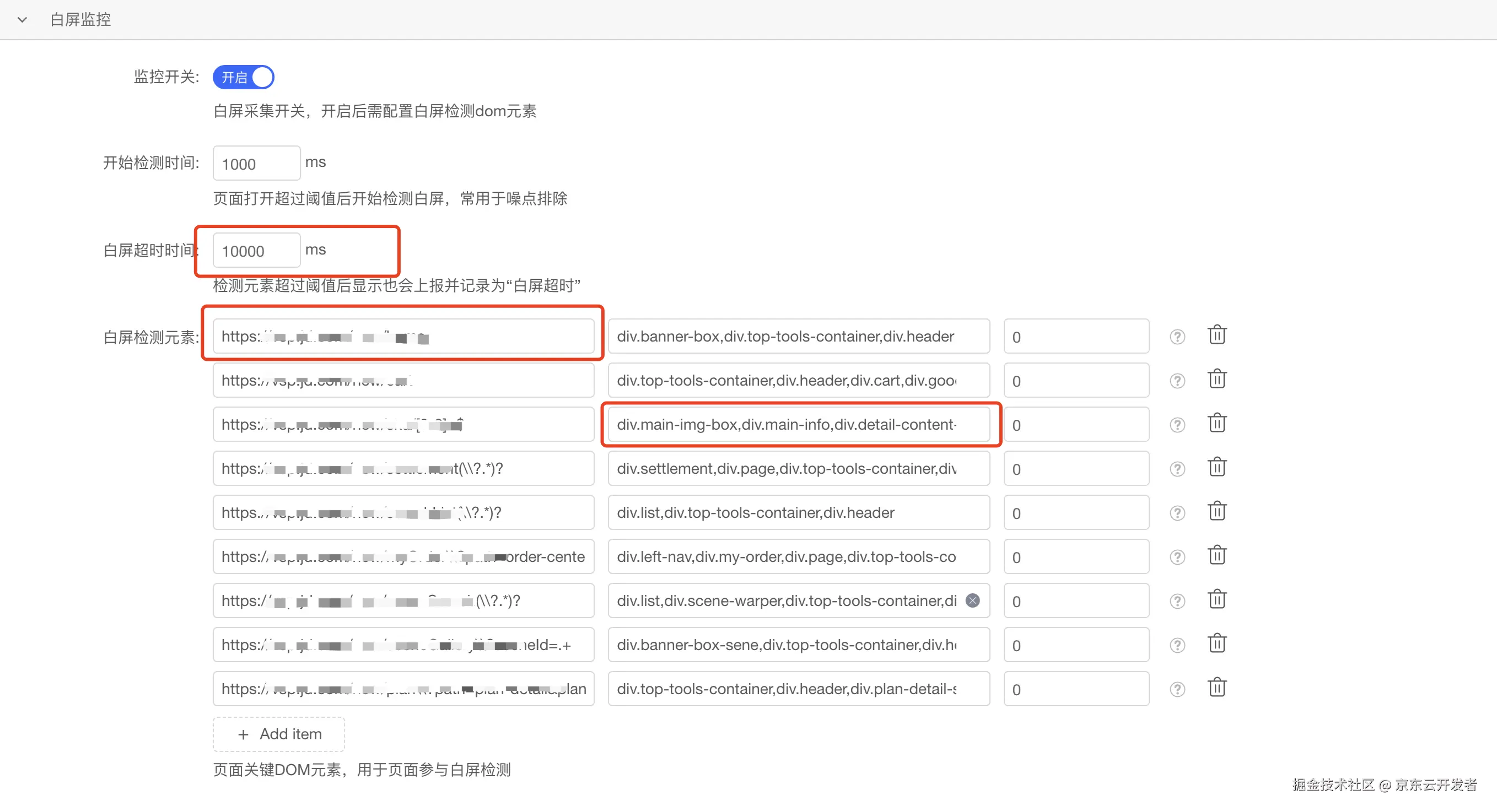 为了监控白屏时间,我们必须在应用的全局配置中的白屏监控项下,指定每个页面的 URL 及其关键元素。同时,我们还需设定监控的起始时间点和超时阈值。值得注意的是,URL 配置支持正则表达式,这为我们提供了灵活性,以匹配和监控一系列相似的页面路径。