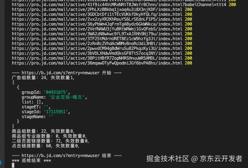 自动化巡检工具能够检测页面上的多种元素和链接,包括 a 标签的外链、接口返回的链接、鼠标悬停元素、点击元素,以及跳转后 URL 的有效性。该工具尤其适合用于频道页,这些页面通常通过投放广告和配置通天塔链接来生成。在大型促销活动期间,我们可以运行脚本来验证广告和通天塔链接的有效性。目前,工具的功能还相对有限,并且对于广告组等特定接口的支持不够通用,这也是我们计划逐步改进和优化的方向。