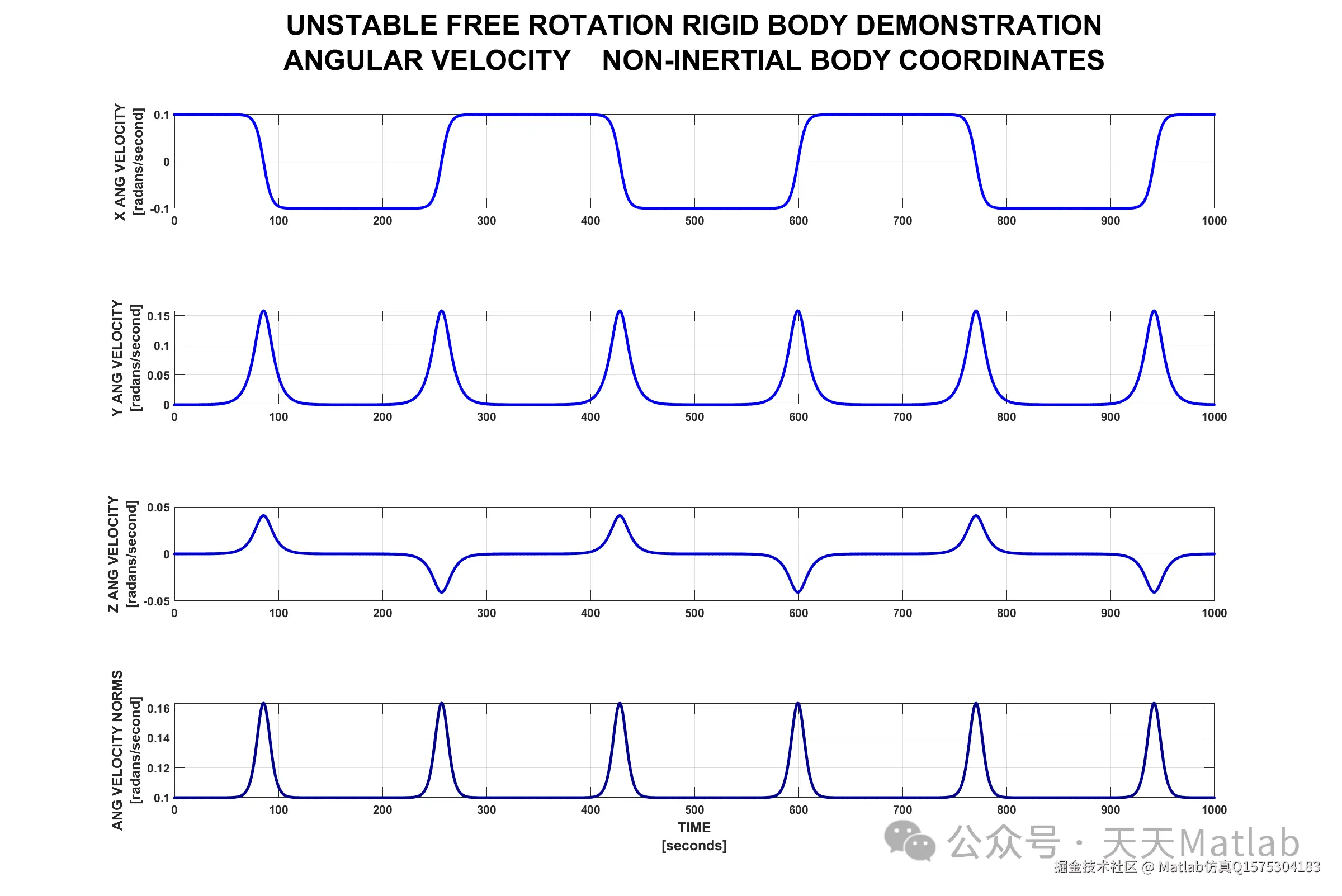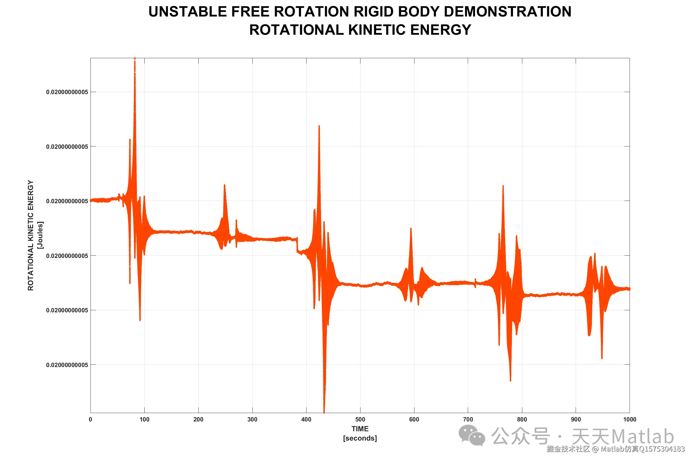 通过运行该代码,我们可以看到刚体在不稳定自由旋转的情况下,角速度在三个轴上呈现出复杂的振荡变化。这体现了刚体内部的能量在三个轴之间不断转换,导致旋转不稳定。