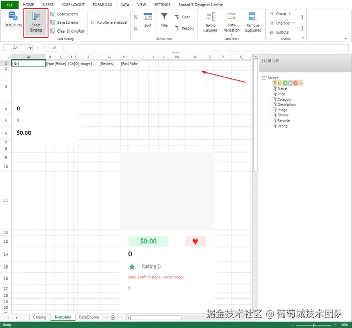 此页面包含用于在目录表上创建产品列表的模板范围。 首先要做的是排列单元格,然后设置单元格的绑定路径。 它可以通过 Javascript 使用 SpreadJS 的 setBindingPath 方法来完成。