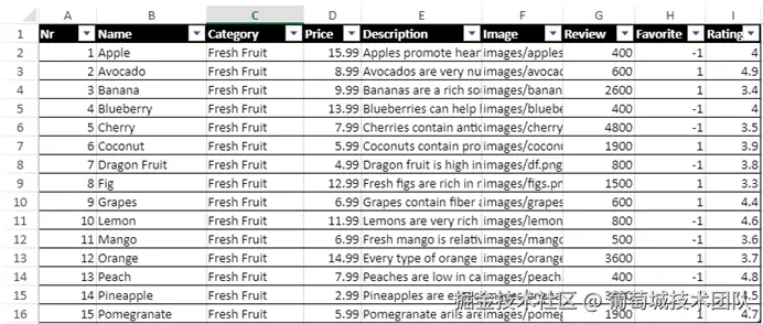 数据源表包含有关不同产品的数据。它们位于名为 tbProducts 的表中。 此表包含有关名称、类别、价格、评级等的信息: