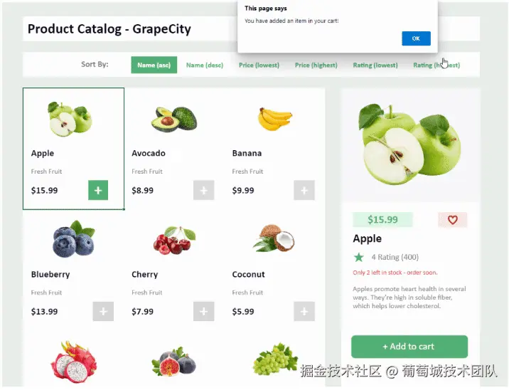 添加到购物车按钮是一个简单的按钮,显示可以使用超链接功能调用最终将商品添加到购物车的事件或调用其他一些电子商务支付功能。该按钮显示该项目已添加到购物车的警报。