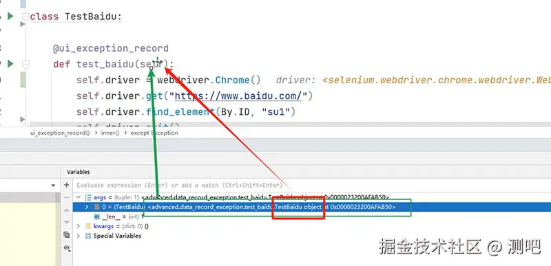 # ====问题3: 被装饰的函数test_baidu()还没执行, 就先调用了装饰器ui_exception_record,此时还没有self.driver,导致args[0]还获取不到self