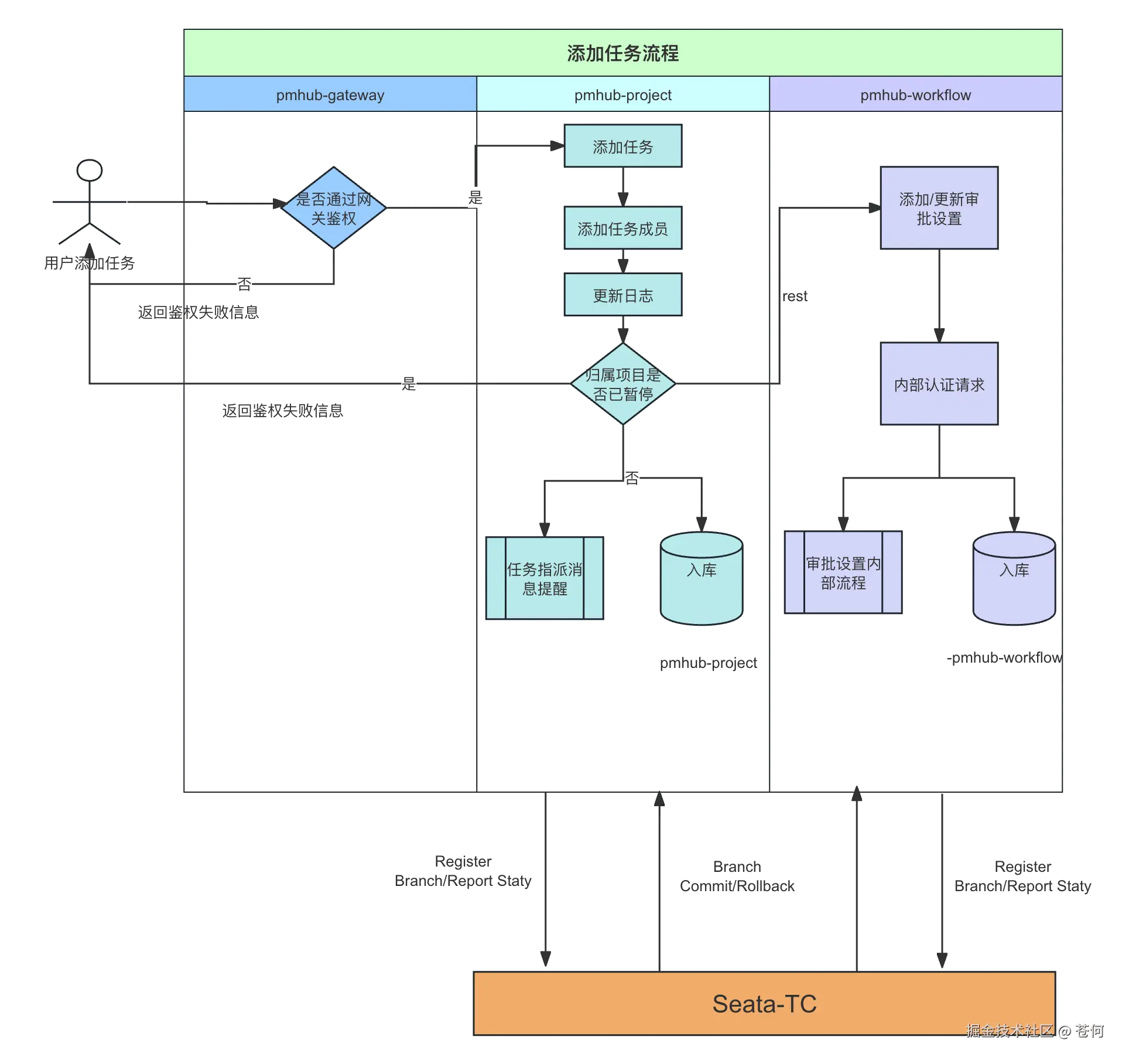 在 PmHub 中通过 Seata 来处理添加任务过程中的分布式事务逻辑,这是原先逻辑流程: