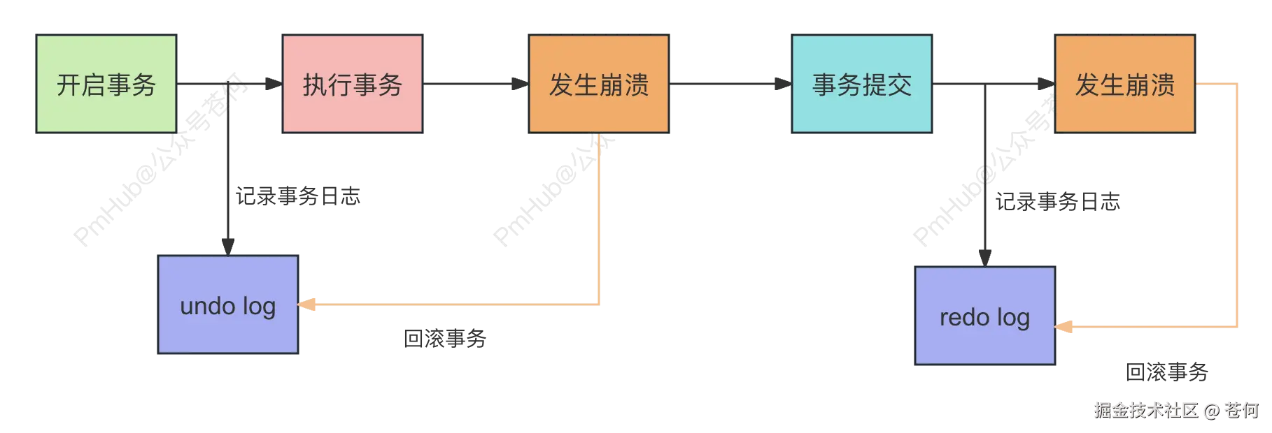 MySQL 中主要是通过 redo log 和 undo log 来控制事务,redo log 是在事务提交前回滚,保证事务的持久性, undo log 是在事务提交后回滚,保证事务的原子性,具体可以看下面这张图: