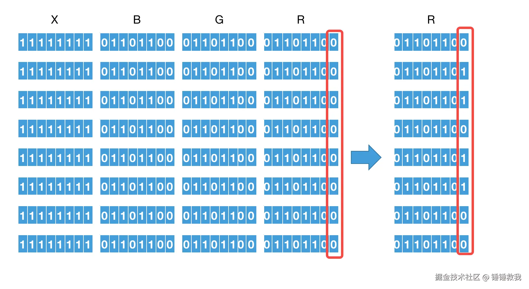 比如这是utf8编码下的 l 字符 我们使用8个像素点,对每个像素点的最低位进行修改,变成
