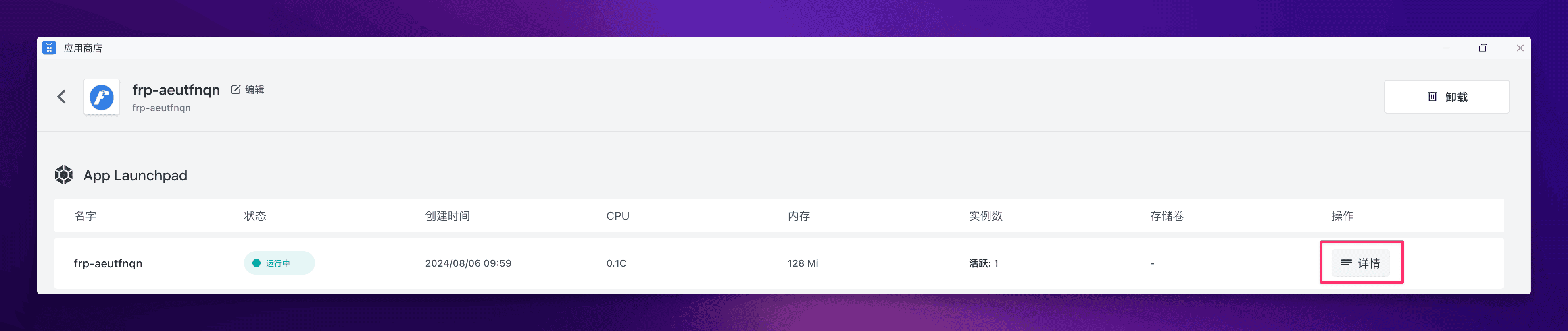 填好参数之后,点击右上角的 “部署应用” 开始部署。部署完成后,直接点击应用的 “详情” 进入该应用的详情页面。