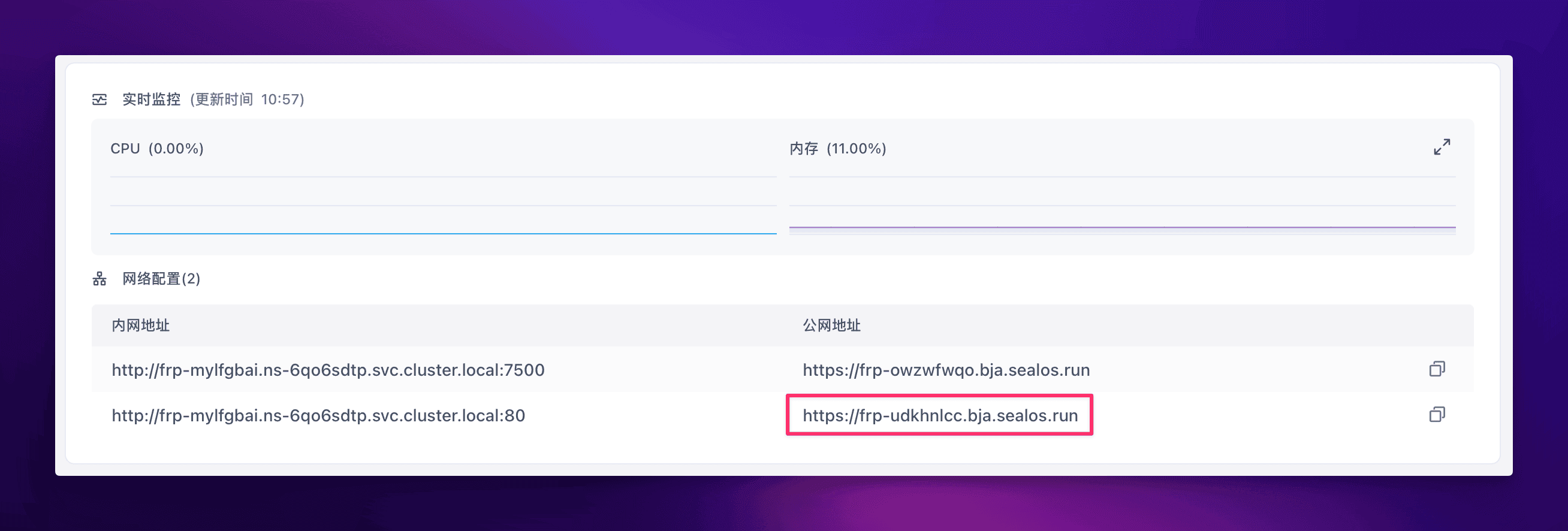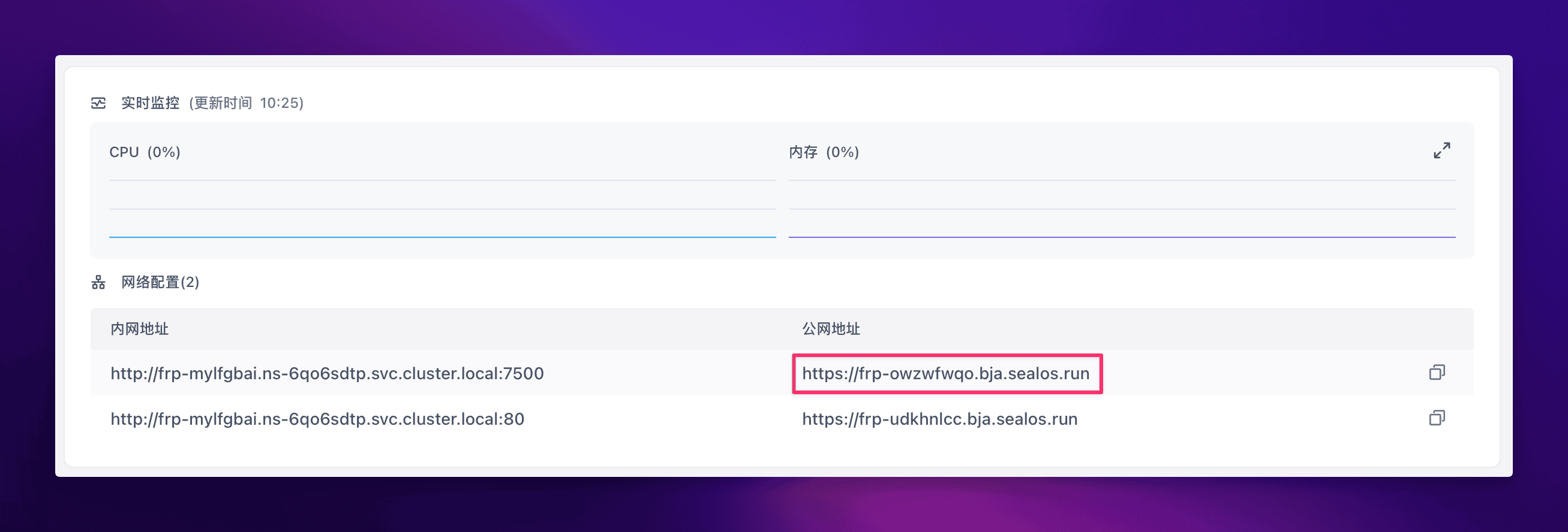 等待应用状态变成 running 之后,直接点击端口 7500 对应的外网地址便可打开 frp 的管理界面。