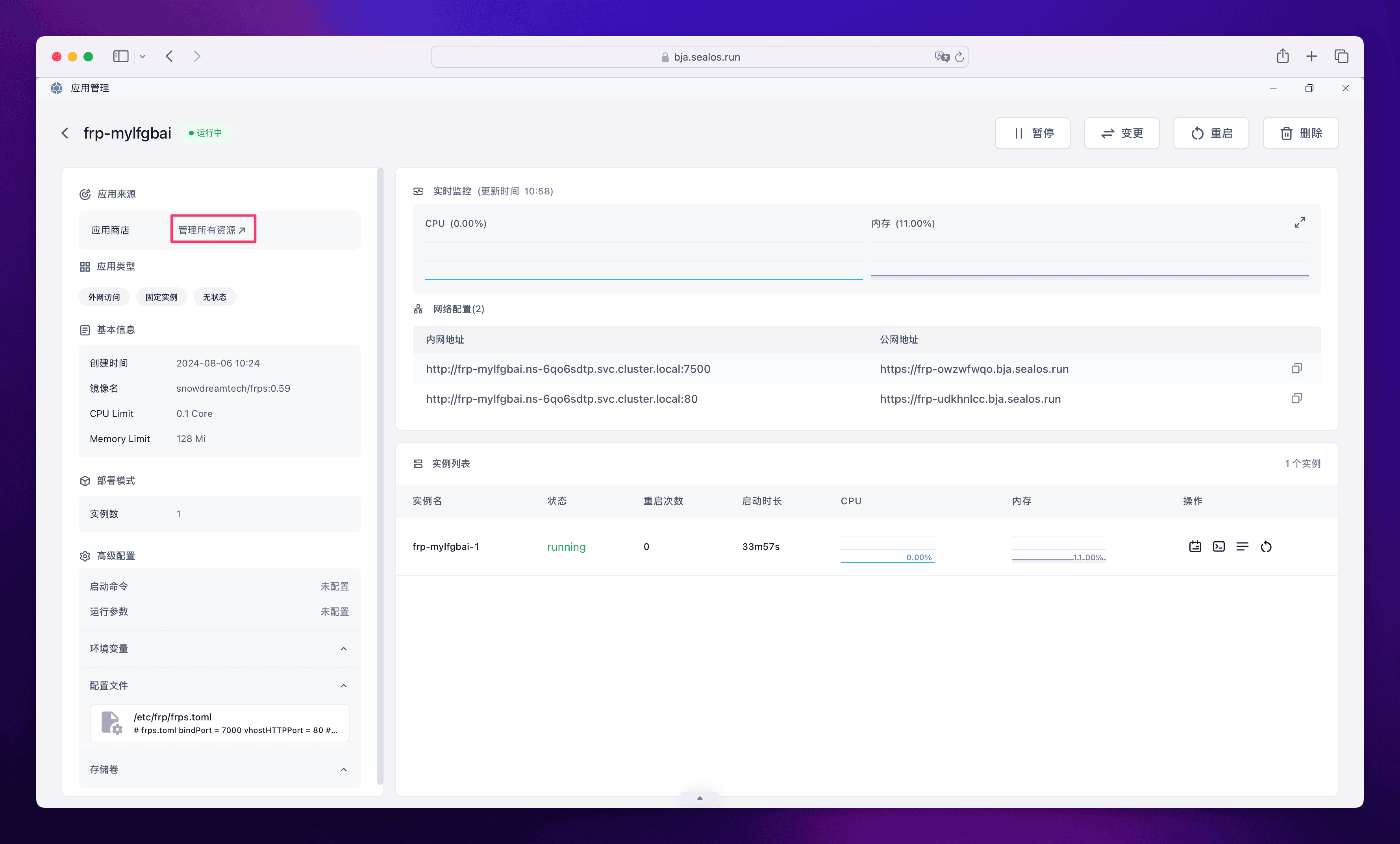 serverPort的值替换为你的 frp 服务的 7000 端口对应的外网端口。在 frp 服务详情页面点击左上角的 “管理所有资源”: