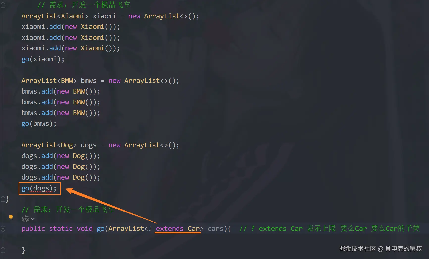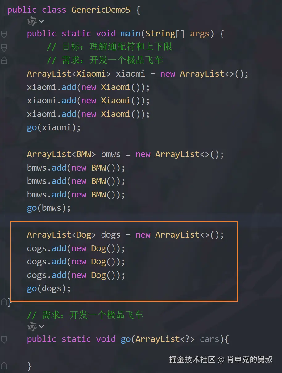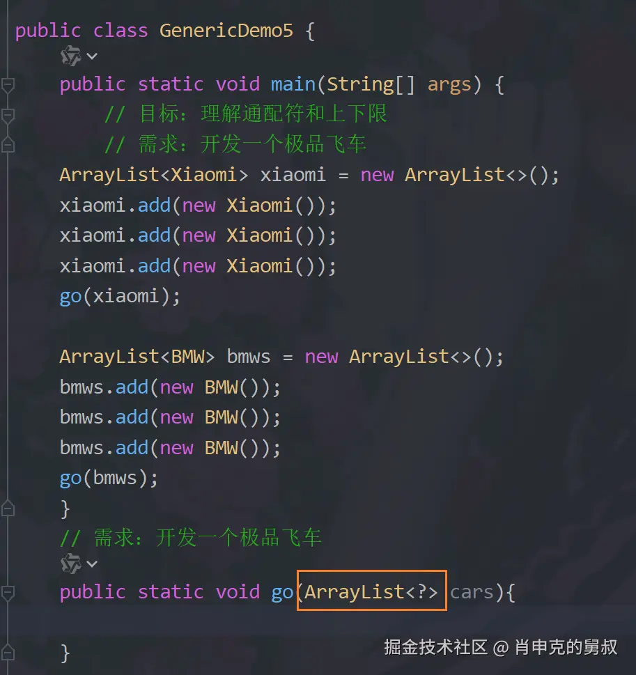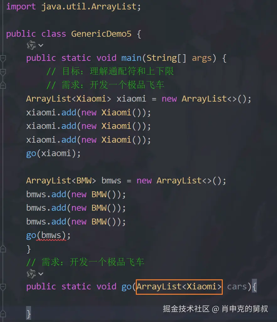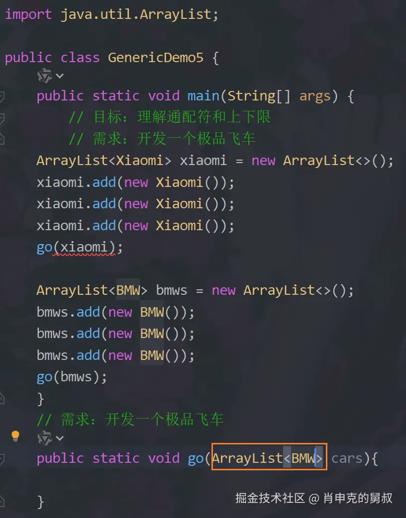 我们模拟一下极品飞车,有很多车的对象,现在要写一个go方法,让不同的车在一起来比赛,如果参数是ArraryList,那么可见上面go(bmws)的话就会报错,改为ArraryList,go(Xiaomi)又会报错wuwuwu