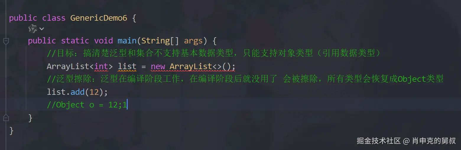 至于为什么只能支持对象类型,这就涉及到泛型擦除: 泛型在编译阶段工作,在编译阶段后就没用了会被擦除,所有类型会恢复成Object类,然而如果是基本数据类型不能恢复成Object这种对象类型。Object只能指向对象。