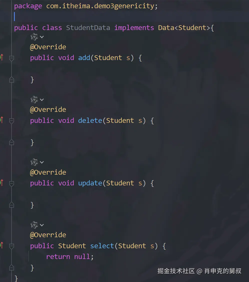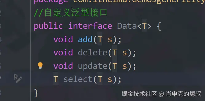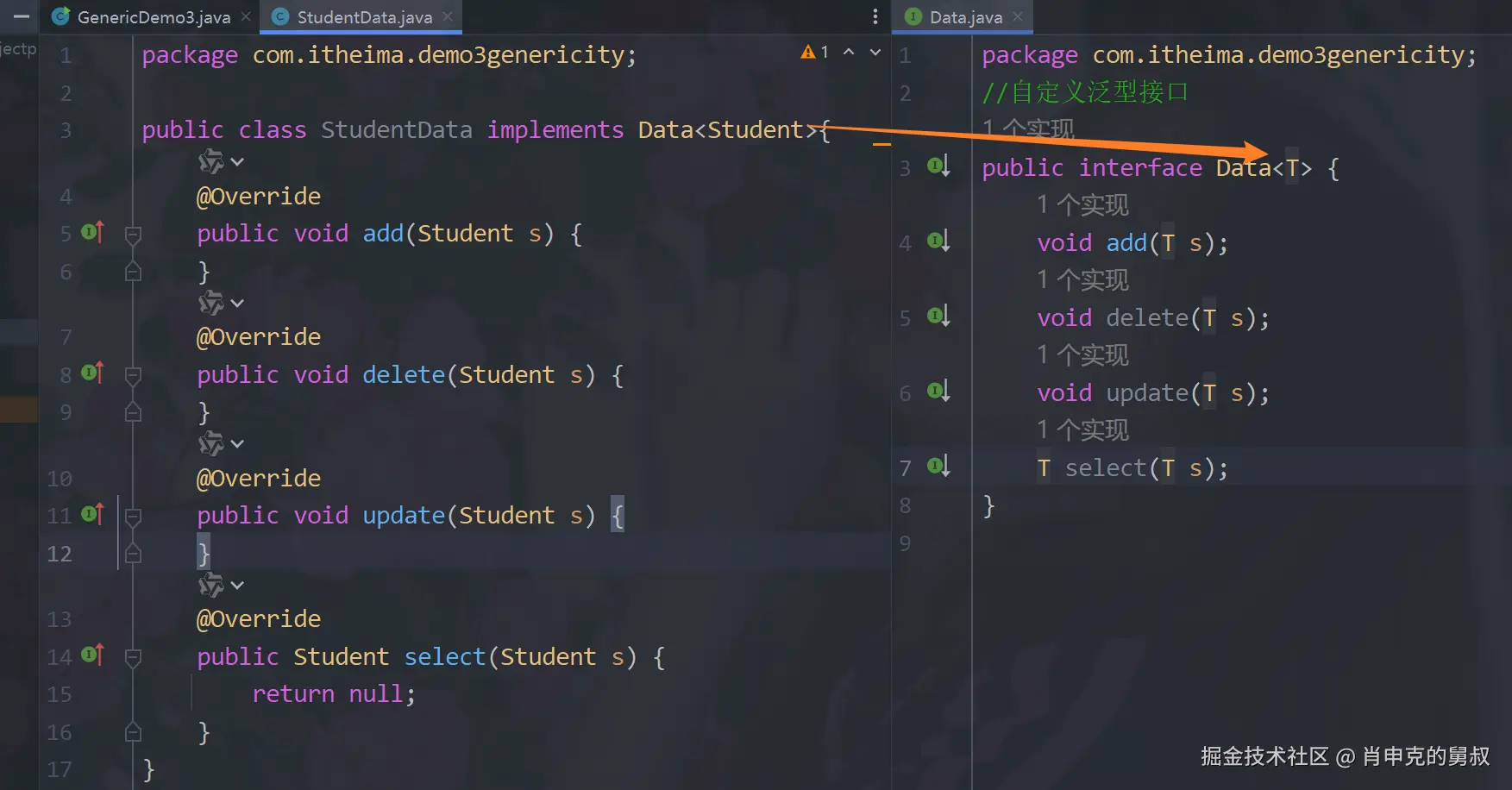 通过泛型的标签<>就可以去确定接口的类名变量,你要操作哪个数据,你在实现这个接口的时候,你就应该传哪个数据,得到(重写)的功能就全是针对于它的。