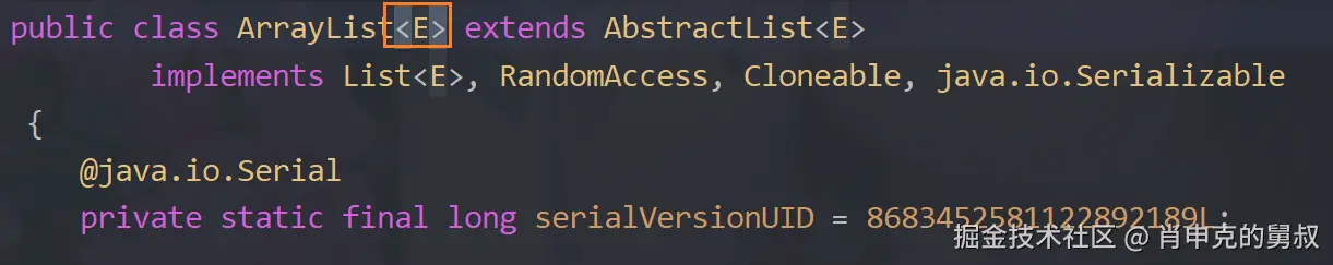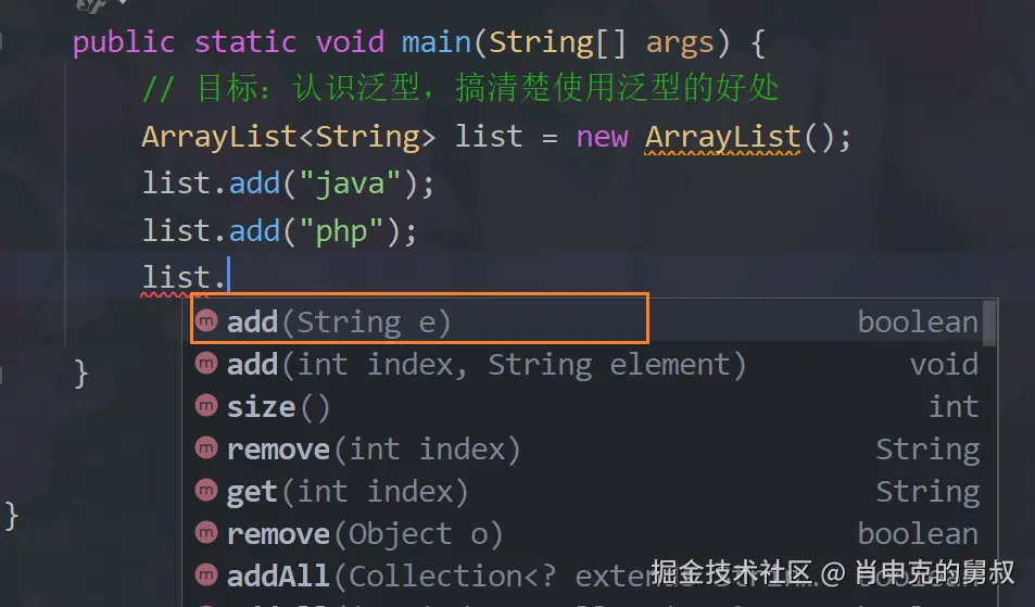 这个E是接收 标签<> 传递过来的类型变量,然后在后面的所有E都变成了String,比如看这个add方法: