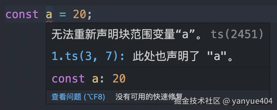 另外,得益于 TypeScript 强大的 类型推论,上面的代码并没有手动声明变量 foo 的类型,但在变量初始化时自动推论出它是一个 number 类型: