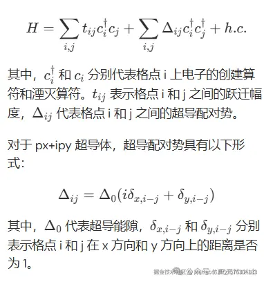 紧束缚模型是一种简化的电子能带理论,它假设电子主要局域在原子核附近,并通过跃迁相互作用。对于 px+ipy 超导体,我们考虑一个二维方晶格,每个格点上有一个电子。电子之间的相互作用由以下哈密顿量描述: