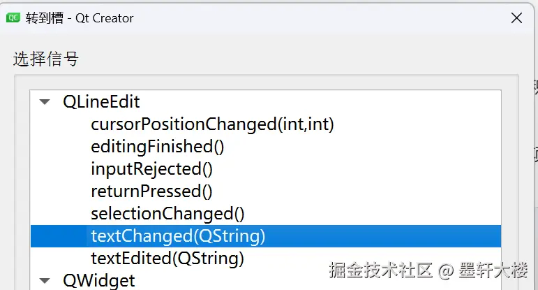 - 在“LineEdit”编辑框上单击鼠标右键,在弹出的下拉菜单中选择“转 到槽...”菜单项,在弹出的对话框中选择“textChanged(QString)”信号,如图