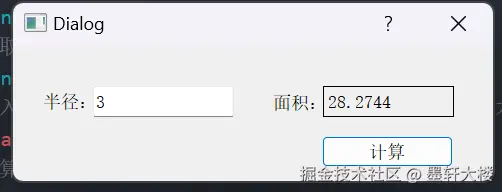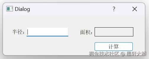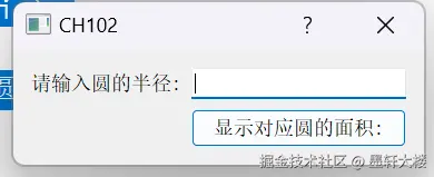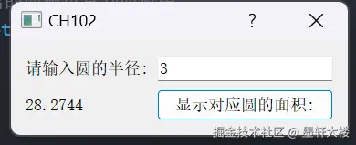 - 在LineEdit中输入圆半径值,单击“显示对应圆的面积”按钮后,在 label2中显示圆面积值