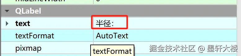 - 在Qt Designer设计器的属性栏中修改,如修改表示半径的Label标签 ,如图所示: