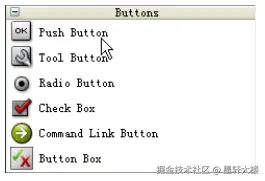 在Buttons容器栏中找到PushButton按钮控件,拖曳此控件 到中间的编辑框中,用于提交响应单击事件