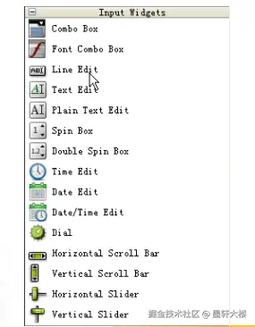 在Input Widgets容器栏中找到LineEdit文本控件,拖曳此 控件到中间的编辑框中,用于输入半径值