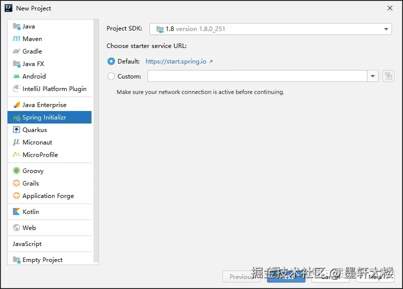 本质上Spring Initializr是一个Web应用程序,它提供了一个基本的项目结构,能够帮助开发者快速构建一个基础的Spring Boot项目。在创建Spring Initializr类型的项目时需在计算机连网的状态下进行创建。