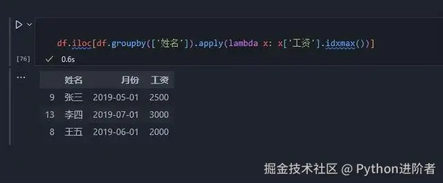 第二个方法是【༺࿈黑科技·鼓包࿈༻】提供的,代码如下:df.iloc[df.groupby(['姓名']).apply(lambda x: x['工资'].idxmax())]