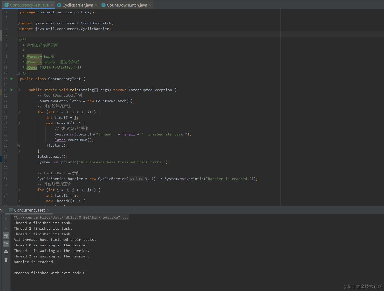 如上测试案例代码,它是一个并发工具使用示例,我写的目的主要是为了展示如何在 Java 中使用 CountDownLatch 和 CyclicBarrier。下面是对代码的简要解释: