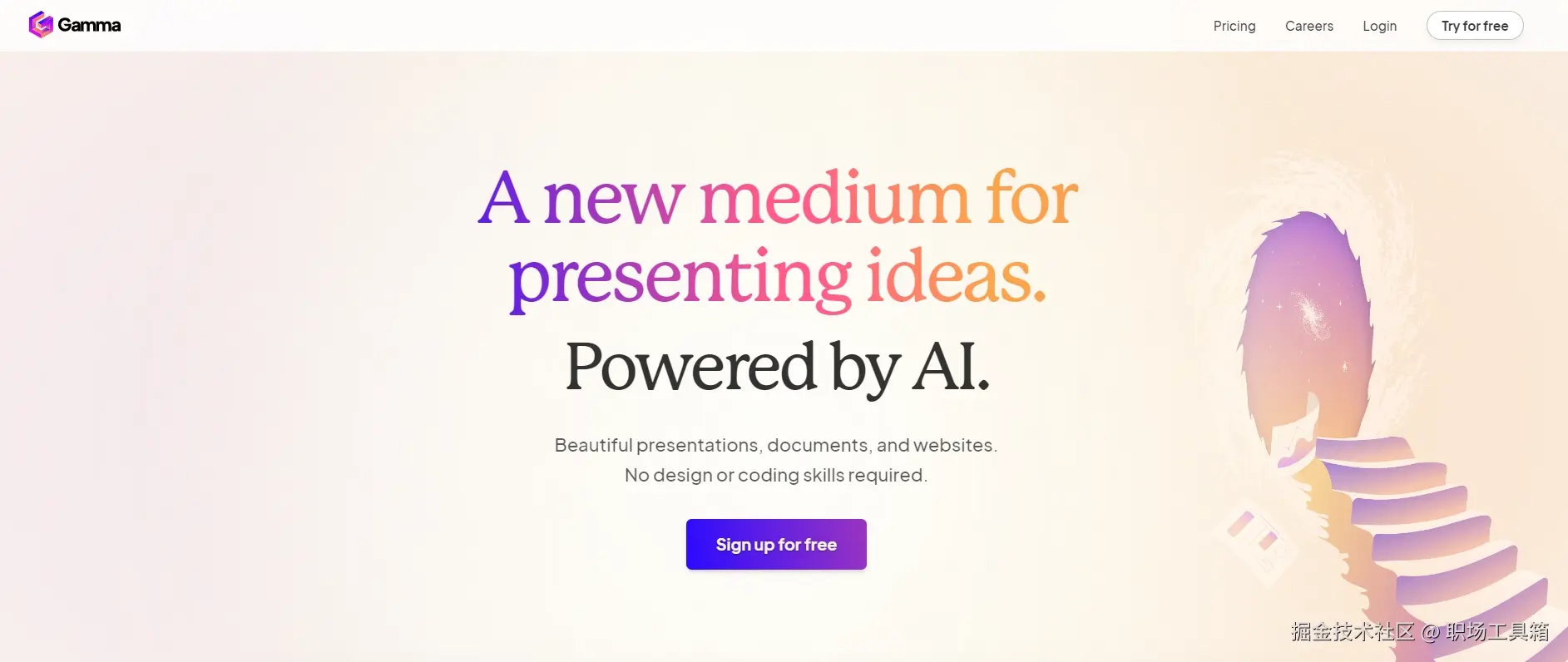 Gamma是一款以简约而不简单为设计理念的AI PPT制作工具,非常适合那些不想花费过多时间但又希望汇报内容精致的用户。