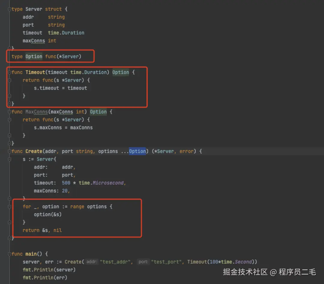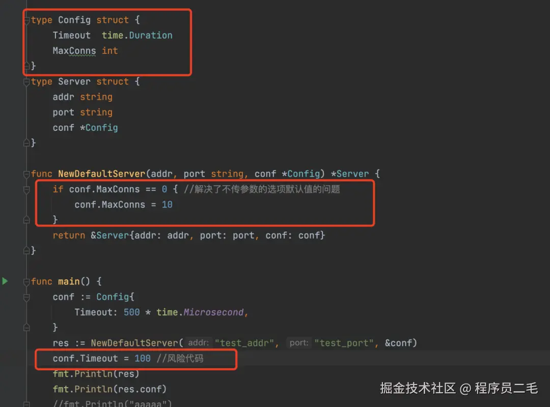 - 既然是初始化一些配置选项,那么当然是有的是必选项(Addr, Port),有的是可选项(Timeout,MaxConns),可选项不选的话还得给个默认值,显然这种方式是不满足的