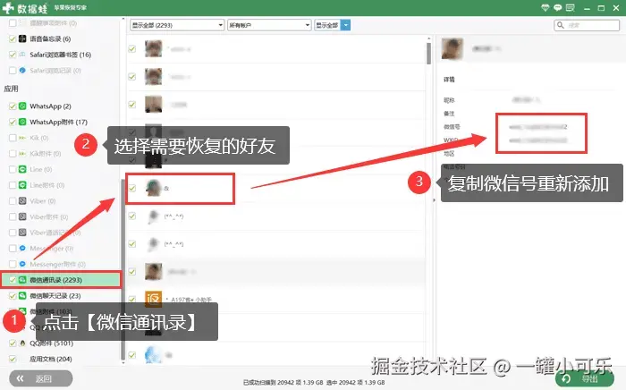 步骤3:扫描完成后,点击 【微信通讯录】 ,你可以预览每个好友的详细信息,并选择你想要恢复的好友,复制其微信号至其他设备重新添加好友即可。