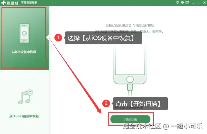 步骤2:使用USB数据线将你的苹果手机连接到电脑上,选择数据扫描方式,然后点击 【开始扫描】 按钮。