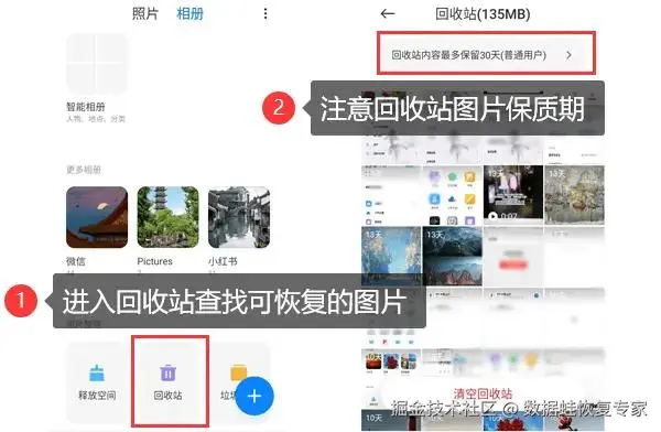 第一步:回收站恢复照片。进入手机相册,找到回收站文件夹,查看里面的图片并恢复。
