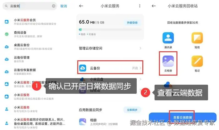 第二步:云端备份。进入手机设置,搜索 【云服务】 ,查看手机备份的相册,将需要的图片重新下载至手机。