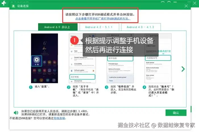 注意:不同连接方式的要求不一样,例如,数据线连接需要打开手机的USB调试模式,可在界面中获取开启帮助。