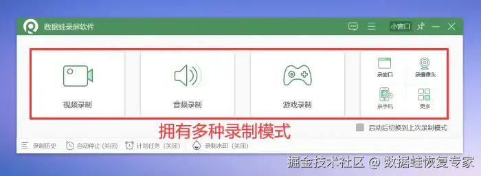 步骤1:进入数 据 蛙官网中将该软件下载到您需要进行录屏的电脑上。进入软件首页,可以根据您的需求选择不同的录制模式。在此以 【视频录制】 模式为您演示操作步骤。