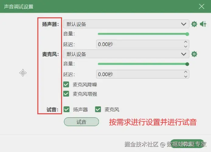 步骤3:对录制的声音不确定的用户,可以进入 【声音调试设置】 中进行再次检查,并可以进行试音操作,让录制视频的声音万无一失。设置完毕,返回录制界面点击 【REC】 即可进行录屏。