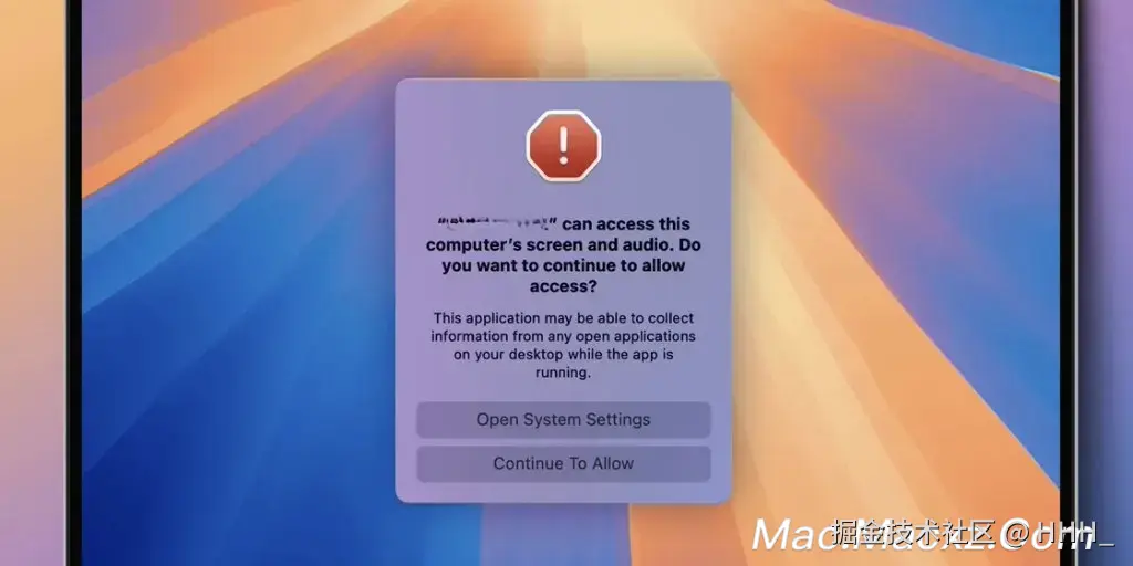 新系统弹窗将明确告知用户,该应用程序可以访问电脑的屏幕和音频,并可能收集桌面上所有打开应用的信息,用户可以选择继续允许访问或前往系统设置修改权限。