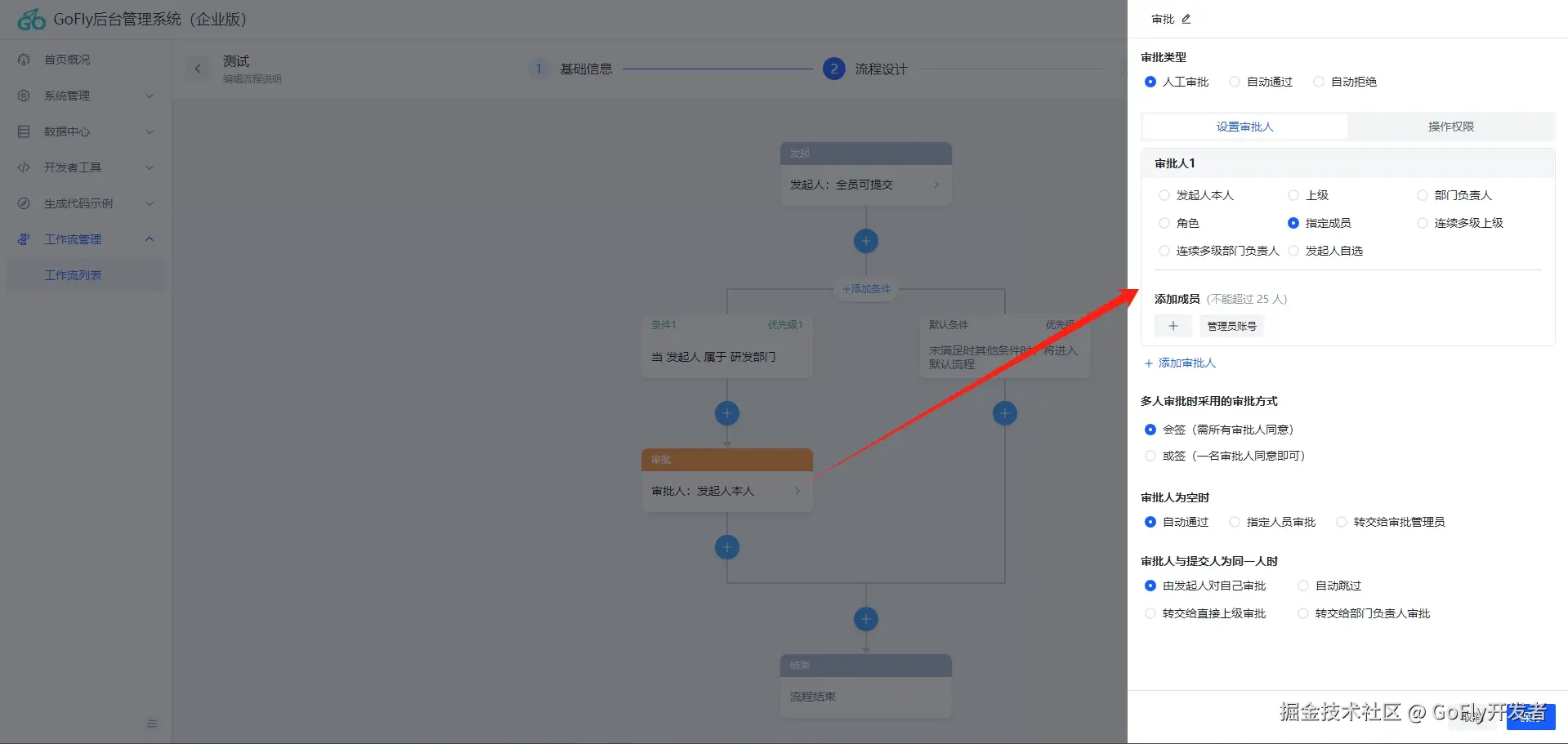 - 审批节点:配置节点的审批人,支持多级审批、会签、或签,流程流转过程中也支持加签、减签;